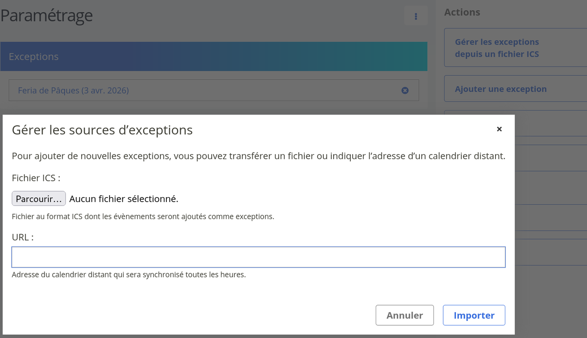 Il est également possible de gérer les exceptions depuis un fichier ICS :