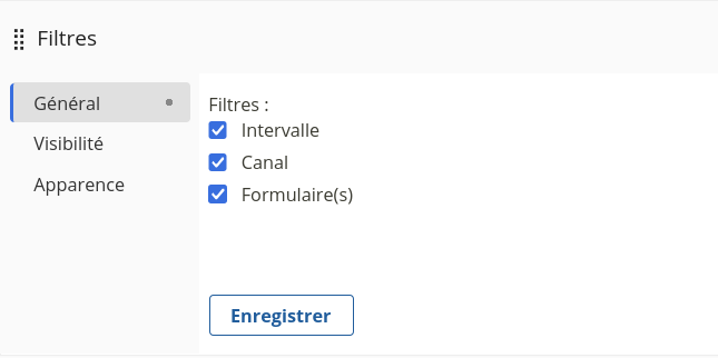 Les filtres affichés correspondent uniquement aux critères communs à toutes les cellules Graphe de la page : lorsqu'un seul graphique ne prend pas en charge un filtre, celui-ci n’est pas proposé.