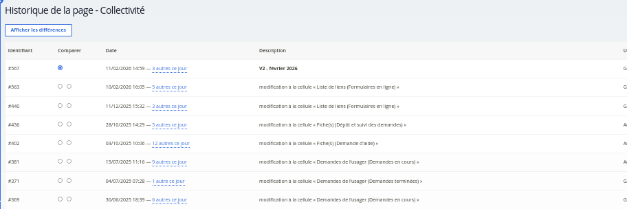 Permet de consulter l'historique des modifications effectuées sur la page et de voir, exporter ou restaurer une précédente version.