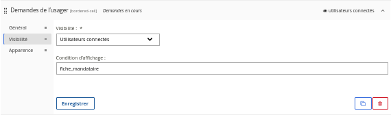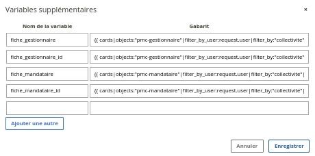 La valeur d’une variable se récupère en utilisant son nom. Par exemple, si vous créez une variable nommée fiche_mandataire, sa valeur peut-être utilisée dans une condition d'affichage avec : fiche_mandataire.