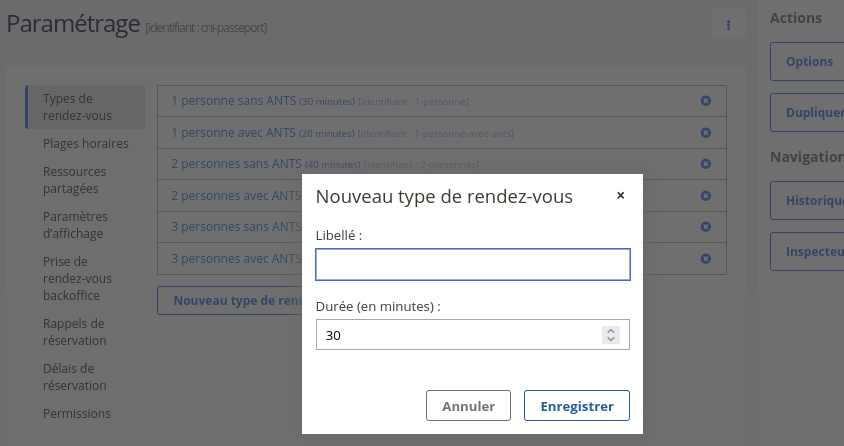 Les types de rendez-vous permettent de proposer des créneaux de durées différentes en fonction de l’objet du rendez-vous. Ils sont particulièrement utiles lorsque tous les rendez-vous ne nécessitent pas le même temps de traitement.