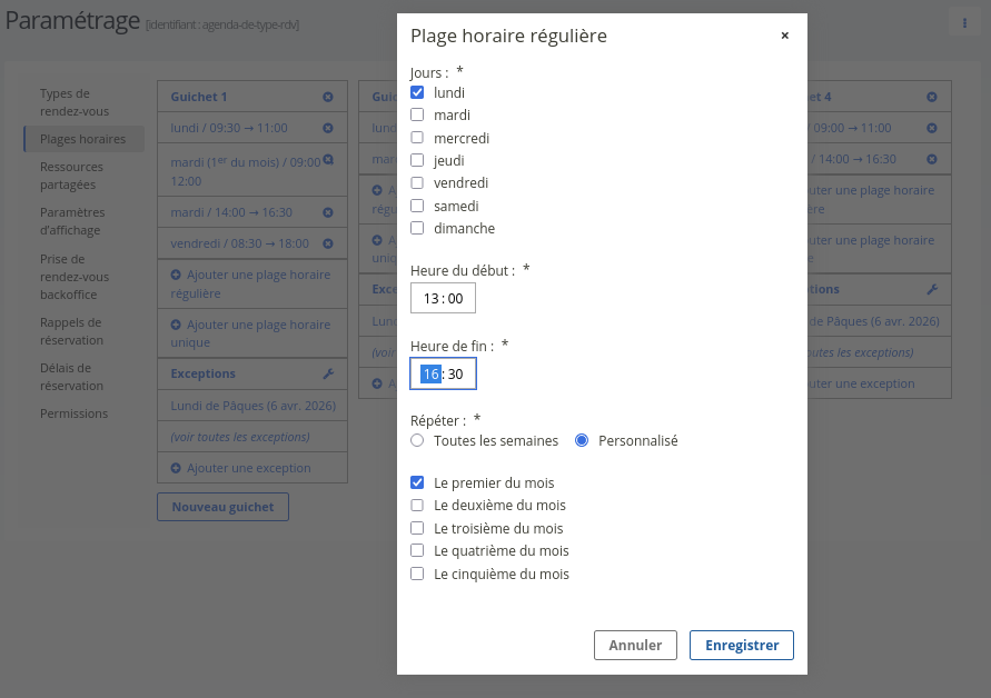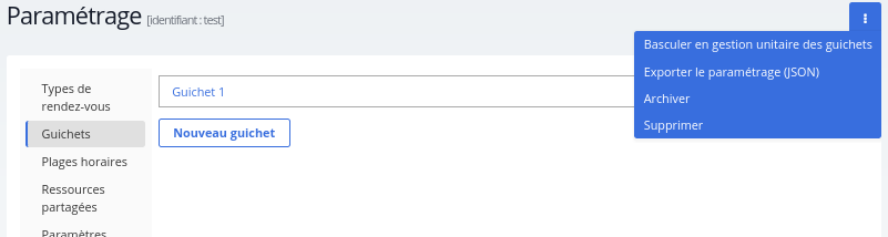 Il est possible de « Basculer en gestion unitaire des guichets » (depuis le menu kebab). Chaque guichet peut alors être configuré indépendamment, avec ses propres plages horaires et ses propres exceptions.