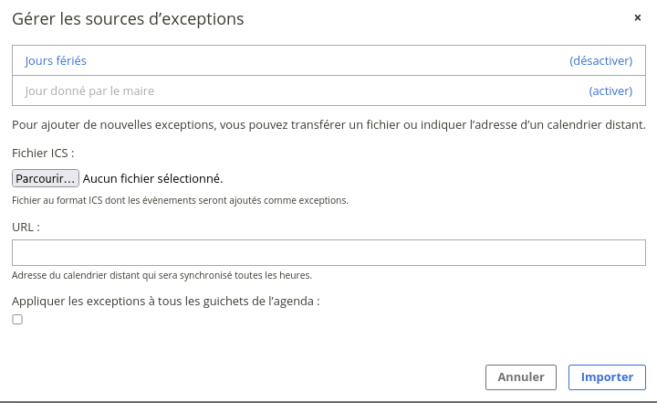 - activation d’une source d’exceptions. Par défaut, la source jours fériés est activée, ce qui permet d’exclure automatiquement les jours fériés des créneaux proposés ;