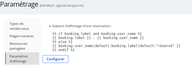 - {{ booking.label }} → intitulé du rendez-vous