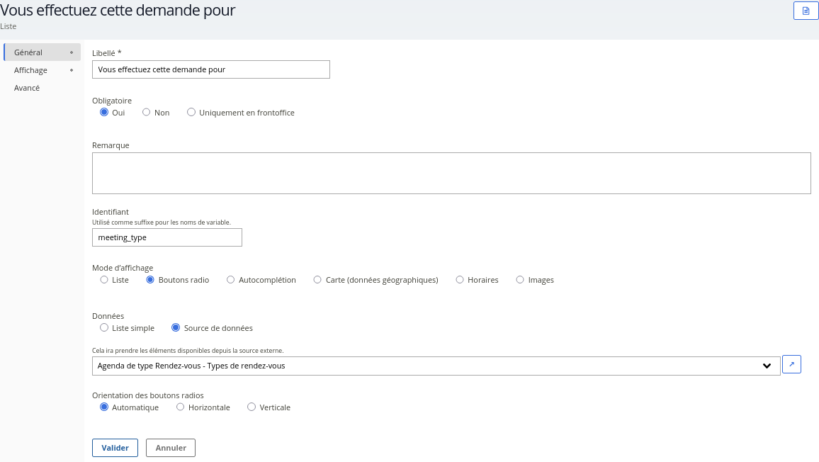 Cette source permet d’afficher dynamiquement les types de rendez-vous définis dans l’agenda et de laisser l’usager choisir celui qui correspond à l'objet de sa demande.