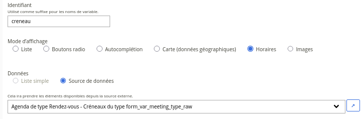Les types de rendez-vous et les créneaux sont exposés dans le formulaire à l’aide de champs de type Liste, configurés pour utiliser des sources de données.