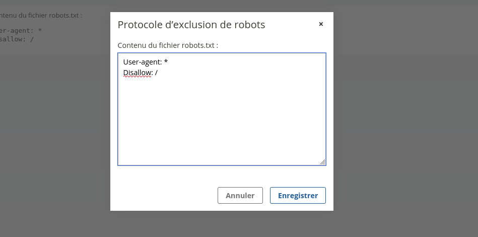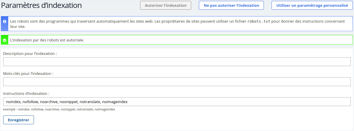 Cette page permet de configurer l’indexation du site par les moteurs de recherche, via les robots d’indexation qui parcourent automatiquement les sites web.