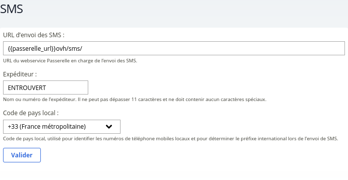 URL d’envoi des SMS : URL du webservice Passerelle chargé de l’envoi des SMS.