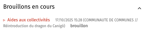 - Portail citoyen > Brouillon en cours : le résumé de gabarit des brouillons est désormais affiché à l'instar de ce qui existait déjà pour les demandes enregistrées (lorsqu'un gabarit de résumé est renseigné dans le formulaire).