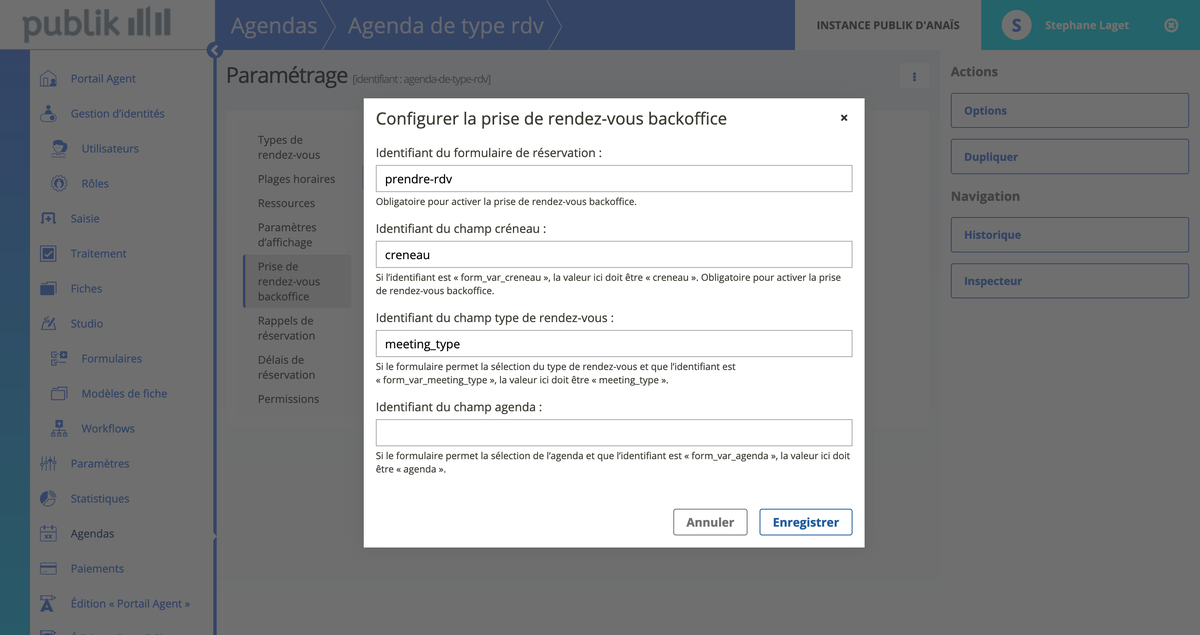 - Agendas : première étape pour permettre la prise de rendez-vous en backoffice directement à partir de la vue calendrier de l'agenda. Il est dorénavant possible de définir les paramètres permettant à l’accès direct à la saisie backoffice d’un formulaire pour enregistrer une réservation.